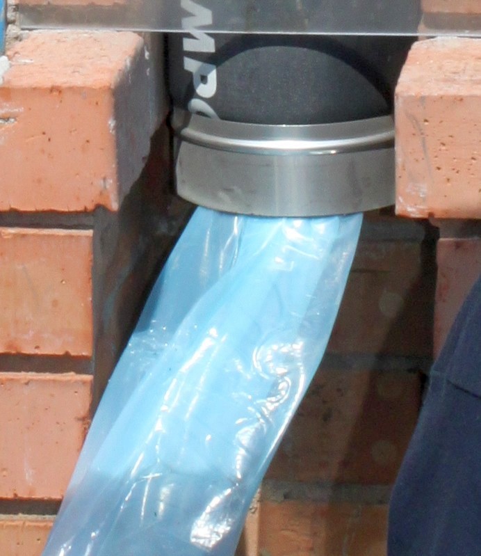 Na oba konce vložky namontujeme kovové hlavice a vložku nafoukneme vzduchovým kompresorem. Tím se rozloží a nafoukne podélně přeložená vložka a zajistí se průchodnost po celé délce pro páru.